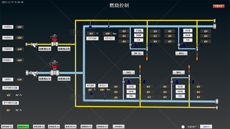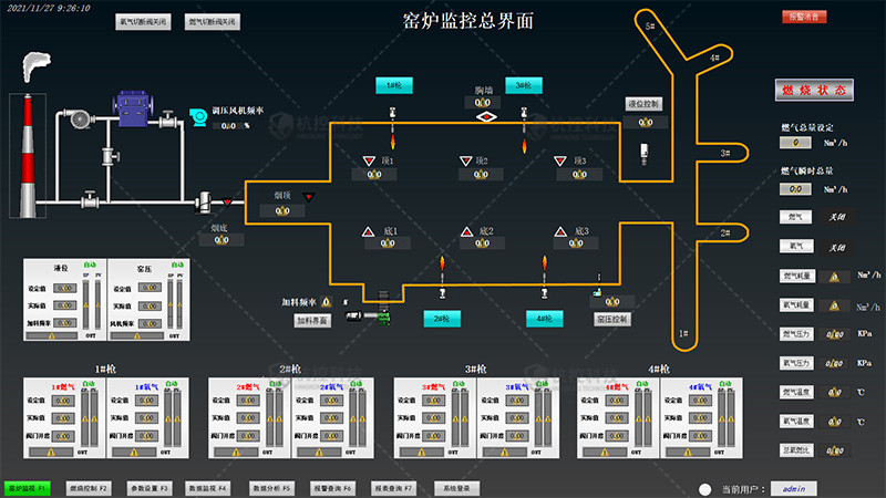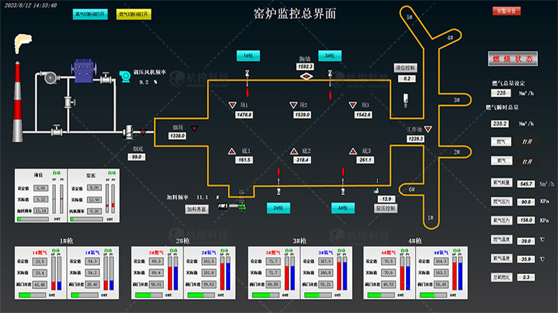 全氧窯爐作為工業(yè)燃燒主要的熱工設(shè)備,是一個(gè)多變量、多回路、高階、時(shí)變的非線性系統(tǒng),許多參數(shù)之間相互關(guān)聯(lián)、相互耦合。從投料到原料在窯爐內(nèi)熔化、澄清、均化和冷卻,經(jīng)過(guò)一系列的物理、化學(xué)反應(yīng),形成均勻、無(wú)氣泡、符合成型溫度要求的熔融玻璃液。這是一個(gè)復(fù)雜的工藝過(guò)程。整個(gè)過(guò)程要求玻璃液的溫度、液位必須滿足工藝要求,以保證產(chǎn)品質(zhì)量。